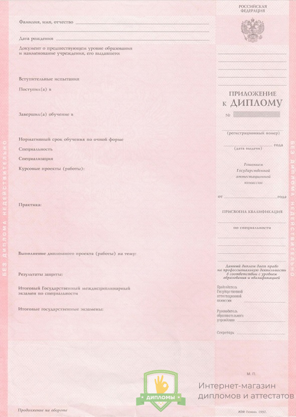 Изготовленный документ в компании «ОК-Дипломы» оформлен согласно действующим в Российской Федерации законам, соответствует нормам и особенностями, присущим тому или иному учебному заведению, имеет все элементы защиты.